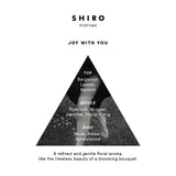Instead of water, the formula features Kito Yuzu* from Tokushima, also used in SHIRO’s skincare line. This ingredient enhances the fragrance with a unique, alluring character.